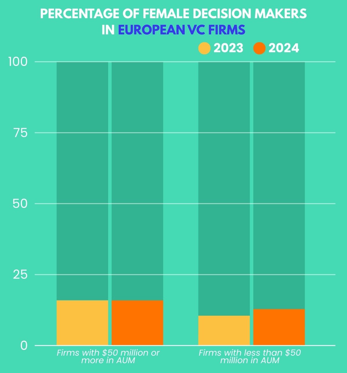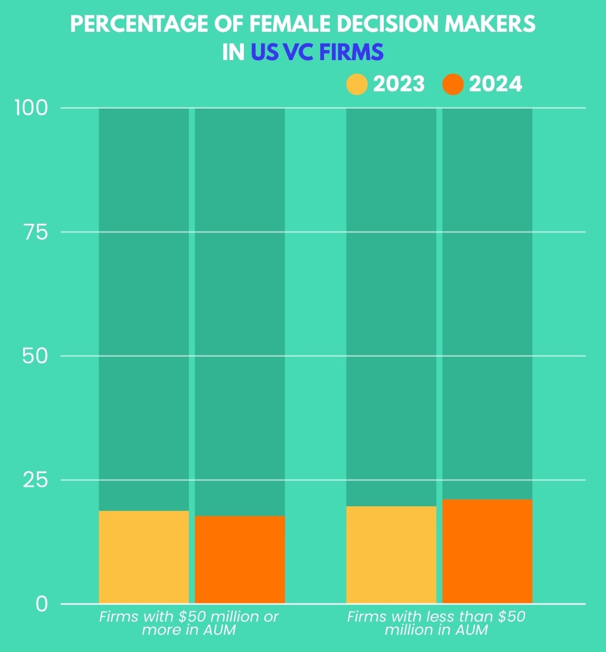 USA: In the United States, women accounted for 17.3% of decision-makers at venture capital firms with at least $50 million in assets under management (AUM) in 2024. This figure has remained largely unchanged from the previous year. At smaller firms that manage under $50 million, women represented 19.5% of decision-makers, rising slightly from 18.8% in the previous year. Although these increases are modest, they indicate steady momentum in smaller firms that often serve as early adopters of diversity.