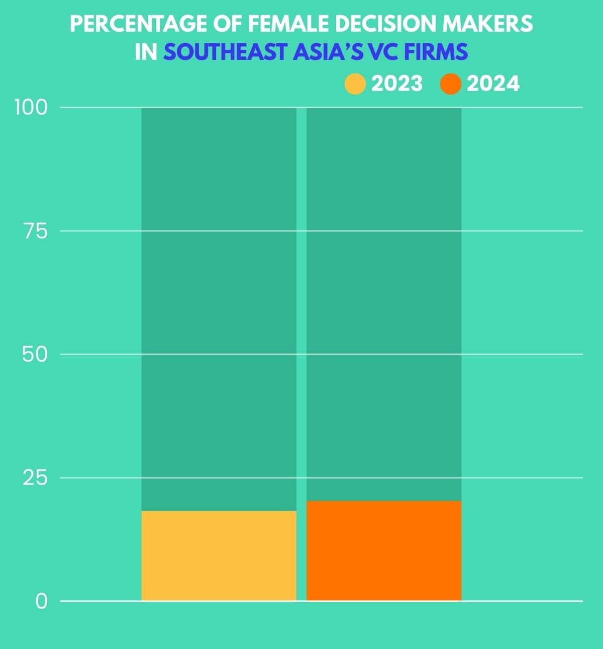 Singapore and Southeast Asia: Singapore stands out markedly within Southeast Asia. The proportion of female investment decision-makers in its venture capital industry rose by 1.6% points over the past year, reaching 34.3%. This is significantly higher than the Southeast Asian average.